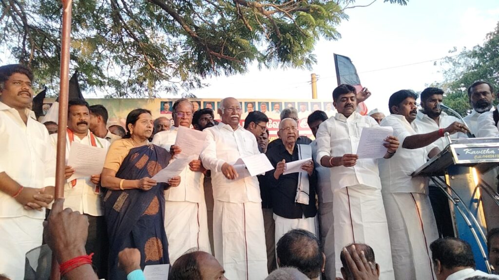 இராமநாதபுரம் மாவட்ட ஆட்சியர் அலுவலகம் முன்பு திமுக தலைமையிலான மதச்சார்பற்ற முற்போக்கு கூட்டணி கட்சிகளின் சார்பில் தமிழ்நாட்டின் உரிமைகளை பறிக்கும் ஒன்றிய பாஜக அரசின் தமிழ்நாடு பட்ஜெட்டை கண்டித்தும், அதற்கு துணைபோகும் அதிமுகவை கண்டித்தும் கண்டன ஆர்ப்பாட்டம் நடைபெற்றது. இந்த ஆர்ப்பாட்டத்திற்கு திமுக கழக மாவட்ட செயலாளரும் சட்டமன்ற உறுப்பினருமான காதர் பாட்ஷா முத்துராமலிங்கம் தலைமையேற்றார். இந்நிகழ்வில் திராவிடர் கழகத் தலைவர் கி. வீரமணி முன்னிலை வகித்து கண்டன உரையாற்றினார். தனது உரையில், ஒன்றிய அரசின் பட்ஜெட் தமிழ்நாட்டின் வளர்ச்சி, நலத்திட்டங்கள் மற்றும் மாநில உரிமைகளை பாதிக்கும் வகையில் அமைந்துள்ளதாக அவர் குற்றம் சாட்டினார். தமிழ்நாட்டின் நியாயமான பங்கு மற்றும் உரிமைகளை பாதுகாக்க அனைத்து அரசியல் மற்றும் சமூக அமைப்புகளும் ஒன்றிணைந்து குரல் கொடுக்க வேண்டியது அவசியம் என வலியுறுத்தினார். மேலும் மாநில, நகர மற்றும் ஒன்றிய கழக செயலாளர்கள், கழக முன்னோடிகள், வட்ட கழக நிர்வாகிகள், கழக உடன்பிறப்புகள் மற்றும் பொதுமக்கள் பெருந்திரளாக கலந்து கொண்டு ஒன்றிய அரசின் அநீதிக்கு எதிராக கண்டன கோஷங்களை எழுப்பினர். ஆர்ப்பாட்டம் அமைதியான முறையில் நடைபெற்றது.