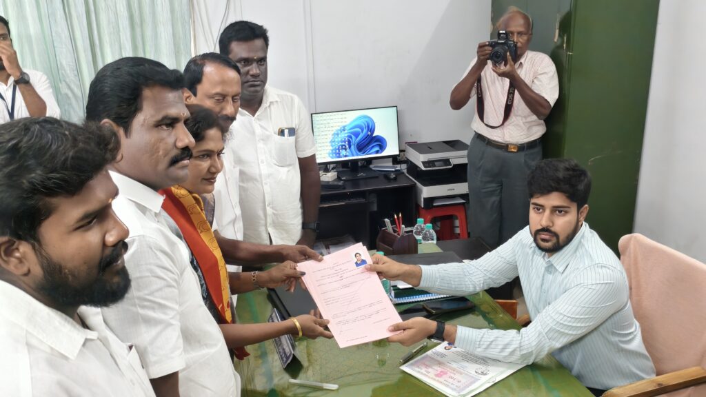 தமிழக வெற்றிக்கழக திருப்பூர் வடக்கு தொகுதி வேட்பாளர் திருமதி சத்தியபாமா அவர்கள் தனது வேட்பு மனுவை தாக்கல் செய்தார் உடன் முன்னாள் அமைச்சர் கோபி செங்கோட்டையன். நிர்வாகி வெள்ளத்துரை உள்ளிட்ட நிர்வாகிகள் உடனிருந்தனர்