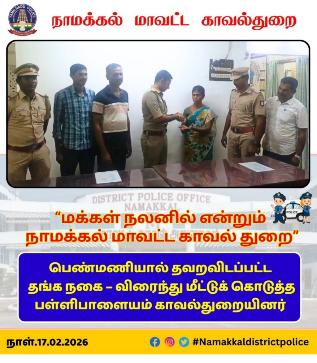 அவரது புகாரின் அடிப்படையில், பள்ளிபாளையம் உட்கோட்ட காவல்துறையினர் உடனடியாக நடவடிக்கை மேற்கொண்டு விசாரணை செய்தனர். தொடர்ந்து மேற்கொண்ட தீவிர தேடுதல் நடவடிக்கையின் மூலம், மல்லிகா அவர்கள் தவறவிட்ட இரண்டரை பவுன் தங்கச் செயினை கண்டுபிடித்து, தேவையான சரிபார்ப்புகளுக்குப் பிறகு பள்ளிபாளையம் உட்கோட்ட காவல் துணை கண்காணிப்பாளர் திரு. கௌதம் அவர்கள் உரியவரிடம் ஒப்படைத்தார்.