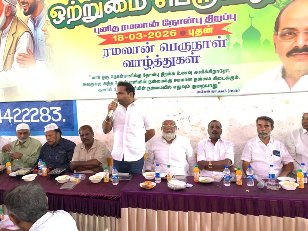 இஸ்லாமியர்களின் புனிதமான மாதமான ரம்ஜான் மாதத்தை முன்னிட்டு இஸ்லாமியர்கள் நோன்பு நோற்று வருகின்றனர்.மேலும் மேலும் சமூக நல்லிணக்கத்தை வெளிப்படுத்தும் வகையில் அனைத்து சமுதாய மக்களுடன் சேர்ந்து நோன்பு திறக்கும் நிகழ்ச்சியை நடத்தி வருகின்றனர் திருப்பூர் மத்திய மாவட்ட திமுக சார்பில் பெரிய தோட்டம் வீதியில் 1000 பேர் பங்கேற்ற நோன்பு திறப்பு விழா மத்திய மாவட்ட செயலாளர் தெற்கு தொகுதி சட்டப்பேரவை உறுப்பினர் க.செல்வராஜ் எம்எல்ஏ வழிகாட்டுதலின்படி நடைபெற்றது இதில் தெற்கு மாநகர செயலாளர் டி கே டி நாகராஜ். பகுதி செயலாளர் உசேன். மாநகர மாணவரணி அமைப்பாளர் செ திலகராஜ்.கழக பொதுக்குழு உறுப்பினர்கள் மஸ்ஊது. சலீம். இந்திய தேசிய காங்கிரஸ் திருப்பூர் மாநகர் மாவட்ட தலைவர் கோபால்சாமி. கவுன்சிலர் பெனாசீர் நசுருதீன் உள்ளிட்ட அனைத்து பள்ளிவாசல் தலைவர்கள்