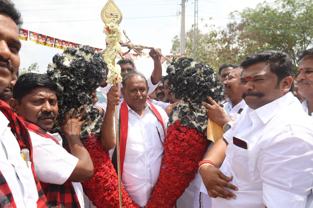 திருமயத்தில் சுழன்று சுழன்று வாக்கு சேகரித்த அமைச்சர் ரகுபதி. புதுக்கோட்டை மாவட்டம் திருமயம் சட்டமன்ற தொகுதி திமுக வேட்பாளர் அமைச்சர் ரகுபதி தீவிர வாக்கு சேகரிப்பில் ஈடுபட்டார் லட்சுமிபுரம் மற்றும் அதன் சுற்றுவட்டார பகுதியில் உதயசூரியன் சின்னத்திற்கு வாக்கு சேகரித்த அமைச்சர் ரகுபதி திமுக ஆட்சியில் செய்த மகத்தான திட்டங்களை எடுத்துக் கூறியும் மீண்டும் ஆட்சி அமைந்தால் செய்யப்படவுள்ள திட்டங்களையும் வாக்காளர்களிடம் எடுத்துக் கூறி உதயசூரியன் சின்னத்திற்கு வாக்கு சேகரித்தார் அப்போது அப்பகுதி மக்கள் வேல் வழங்கியும் சிறப்பான வரவேற்பு அளித்தனர்