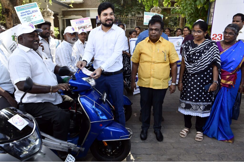 தேனி மாவட்டத்தில் நூறு சதவீதம் ஓட்டுபதிவை வலியுறுத்தி மாற்றுதிறனாளிகள் பங்கேற்ற மூன்றுசக்கர வாகன விழிப்புணர்வு