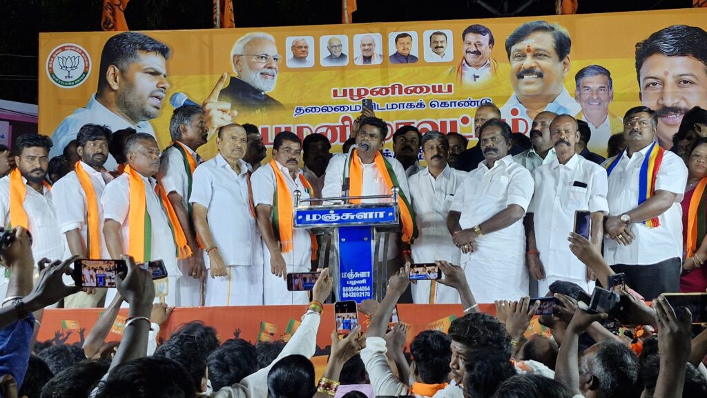 பழனி பஸ் நிலையம் மயில் ரவுண்டானா அருகே ஆர்ப்பாட்டம் நடைபெற்றது. பழனியை தலைமை இடமாகக் கொண்டு பழனியை மாவட்டமாக அறிவிக்க கோரி பாரதிய ஜனதா கட்சி சார்பில் மாபெரும் ஆர்ப்பாட்டம் நடைபெற்றது. மாநில செயற்குழு உறுப்பினர் என்.கனகராஜ் தலைமை வகித்தார். தேசிய பொதுக்குழு உறுப்பினர் வழக்கறிஞர் திருமலைசாமி, மாநில செயற்குழு உறுப்பினர் பழனிச்சாமி, நகர தலைவர் ஆனந்தகுமார், பழனி கிழக்கு தலைவர் கே.பிரகாஷ், பழனி மேற்குத் தலைவர் கவிதாசிவகுமார், மாவட்ட பொருளாளர் பி.ஆனந்த்பெருமாள், மாவட்டத் துணைத் தலைவர்கள் மதன்குமார், எஸ் ரஞ்சிதம், மாவட்ட செயலாளர்கள் ஜெய்கணேஷ், ஸ்ரீகலா, பரமேஸ்வரி ஆகியோர் முன்னிலை வகித்தனர். மாவட்ட பொதுச் செயலாளர் செந்தில்குமார் வரவேற்றார். மாவட்ட தலைவர் ஜெயராமன், பூவேந்தன் ஆகியோர் சிறப்புரையாற்றினார்கள். இக்கூட்டத்தில் ஆர்ப்பாட்ட உரையை, முன்னாள் பாரதிய ஜனதா கட்சி தலைவர் கே அண்ணாமலை பேசியதாவது: பாரதிய ஜனதா கட்சியின் இந்த ஆர்ப்பாட்டத்திற்கு பிறகு, 30 நாட்களுக்குள் பழனியை தனி மாவட்டமாக திமுக அரசு அறிவிக்கும் என நம்பிக்கை உள்ளது. பழனியும் பழனிவாழ் மக்களும் பொருளாதாரத்தில் வளர்ச்சி அடைய வேண்டும். வேலைவாய்ப்பு கிடைக்க வேண்டும். என்றால் பழனியை மாவட்டமாக அறிவிக்க வேண்டும். இல்லை எனில், தேர்தலுக்குப் பிறகு, தமிழகத்தில் தேசிய ஜனநாயக கூட்டணி ஆட்சி அமைந்ததும், பழனியை தலைமையிடமாக கொண்டு தனி மாவட்டம் உருவாக்கப்படும். பழனி நகரம் கோவில் நகரமாக இல்லை. குப்பை நகரமாக உள்ளது. 50,000 முதல் 3 லட்சம் பேர் வசிக்கும் தூய்மையான நகரங்களின் பட்டியலில் இந்தியாவிலேயே பழனி 585 வது இடத்தில் உள்ளது. திண்டுக்கல் மாவட்டத்தில் உள்ள இரண்டு அமைச்சர்களும் கொள்ளையடிப்பதிலேயே குறியாக இருக்கிறார்கள். நன்மை எதுவும் செய்யவில்லை. முதலமைச்சரின் நேரடி கட்டுப்பாட்டில் உள்ள டிஎன்பிஎஸ்சி யில் செய்த குளறுபடியால், குரூப் 2 தேர்வு நிறுத்தி வைக்கப்பட்டுள்ளது. இதனால் ஆயிரக்கணக்கான மாணவர்கள் பாதிக்கப்பட்டுள்ளனர். நீட் தேர்வை ரத்து செய்வதாக கூறிவிட்டு, டிஎன்பிஎஸ்சி தேர்வு நிறுத்தி வைத்துள்ளனர். அமைச்சர் கே என் நேரு 888 கோடி வாங்கிக் கொண்டு, அரசு துறையில் பணி வழங்கி உள்ளதாக ஆழாக்கத்துறை குற்றம் சாட்டியுள்ளது. பழனி முருகன் கோவிலில் நடப்பது எதுவுமே வெளிப்படையாக தெரிவதில்லை. உண்டியல் வருவாய் இரண்டு மாதத்திற்கு ஒரு முறை ரு ரெண்டு கோடி என்று கூறுவதைத் தவிர, வேறு எதுவும் கூறுவதில்லை. ஆண்டுக்கு 220 கோடி வருமானம் வரும் பழனியில் பக்தர்களுக்கு எவ்வித வசதியும் செய்து தருவதில்லை. மதுரை எய்ம்ஸ் மருத்துவமனை கடந்த நாலரை ஆண்டுகளாக கட்டப்பட்டு வருகிறது. ஆனா