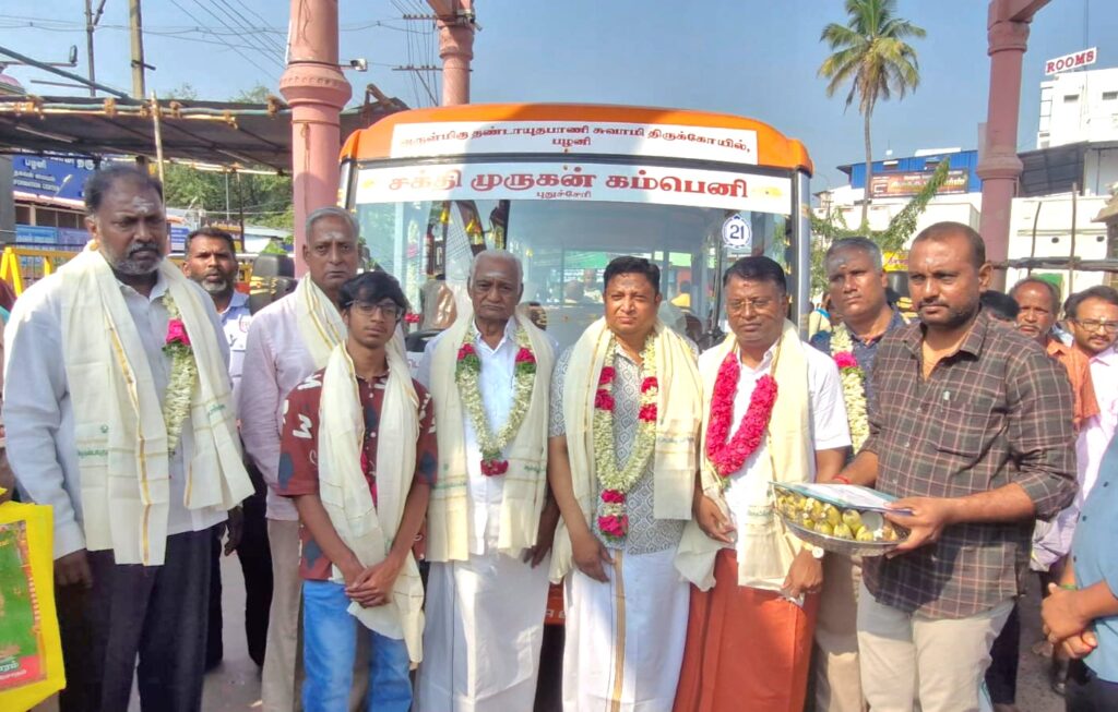 பழனி முருகன் கோவிலுக்கு பக்தர்கள் செல்ல வசதியாக பாண்டிச்சேரி சக்தி முருகன் கம்பெனி சார்பில் நன்கொடையாக 2 வதாக பேட்டரி பஸ் வழங்கப்பட்டது. பழனி முருகன் கோவிலில் ஏற்கனவே 37 எலக்ட்ரிக் வாகனங்கள் உள்ளது. இதற்கான நிகழ்ச்சி ஏற்பாடுகளை கோயில் நிர்வாக அதிகாரி மாரிமுத்து செய்திருந்தார். இந்நிகழ்ச்சியில் திருக்கோயில் உதவி பொறியாளர் மோகன்ராஜ், பாண்டிச்சேரி சக்தி முருகன் கம்பெனி உரிமையாளர்கள் பங்கேற்றனர்