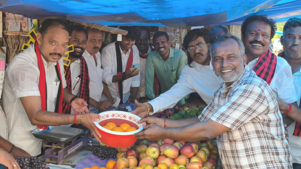 புதுக்கோட்டையில் பழம் வியாபாரம் செய்து வாக்கு சேகரித்த திமுக வேட்பாளர் முத்துராஜா…