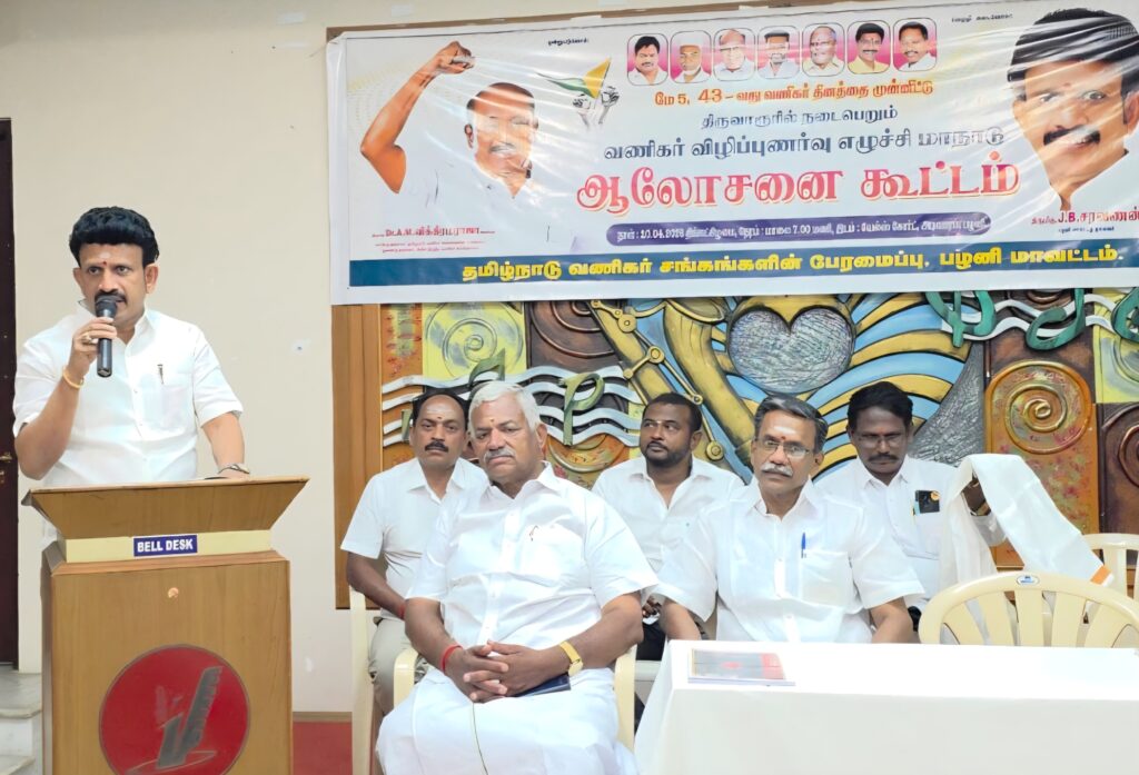 பழனியில் தமிழ்நாடு வணிகர் சங்கங்களின் பேரமைப்பு சார்பில், திருவாரூரில் நடைபெற உள்ள மாநில மாநாட்டையொட்டி ஆலோசனைக் கூட்டம். மாவட்ட தலைவர் ஜே பி சரவணன் தலைமையில் நடைபெற்றது. இதில் சரவண பொய்கை கந்த விலாஸ் என்.பாஸ்கர், கண்பத் கிரேண்ட் அதிபர் என்.ஹரிஹரமுத்து, வள்ளுவர் தியேட்டர் செந்தில்குமார், ஜெகதீஸ், ராதாகிருஷ்ணன், ரம்யா கிருஷ்ணன், பங்கேற்றனர்