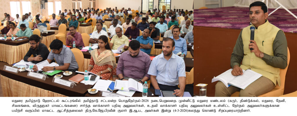 மாவட்டச்-செய்திகள் மாவட்ட ஆட்சியர் அவர்கள் தமிழ்நாடு சட்டமன்ற பொது தேர்தல்-2026 நடைபெறுவதை முன்னிட்டு 6 மாவட்டங்களைச் சார்ந்த வாக்காளர் பதிவு அலுவலர்கள் தேர்தல் அலுவலருக்கான பயிற்சி வகுப்பு கலந்து கொண்டு சிறப்புரையாற்றிய புகைப்படம் Spread the love Post navigation Previous பெரம்பலூரில் மாவட்ட திமுக செயற்குழு கூட்டம் நாளை நடைபெறும் என மாவட்டப் பொறுப்பாளர் ஜெகதீசன் அறிக்கை.Next திருப்பூர் More Stories மாவட்டச்-செய்திகள் இராசிபுரம்:128 குடும்பங்களுக்கு 1. 21 கோடி மதிப்பீட்டில் வீட்டுமனை பட்டா வழங்கிய MP. மாவட்டச்-செய்திகள் பென்னாகரம் அருகே பரபரப்பு… கோயில் வழிப்பாதை ஆக்கிரமிப்புகளை அகற்றக் கோரி மக்கள் சாலை மறியல்! மாவட்டச்-செய்திகள் நலிவடைந்து வரும் மண்பாண்டத் தொழில்!
