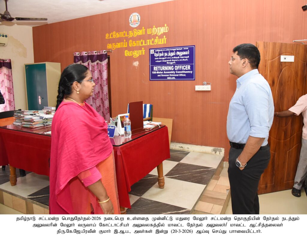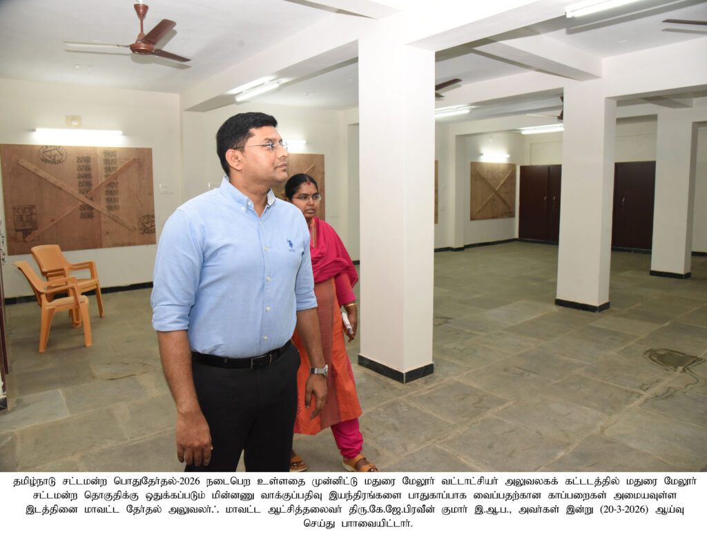 மாவட்ட தேர்தல் அலுவலர்/ மாவட்ட ஆட்சியர் அவர்கள் மேலூர் சட்டமன்றத் தொகுதியின் தேர்தல் நடத்த அலுவலரின் அலுவலகம் மற்றும் மேலூர் தொகுதிக்கு ஒதுக்கப்படும் மின்னணு வாக்குப்பதிவு இயந்திரங்கள் பாதுகாப்பாக வைப்பதற்கான காப்பறைகள் ஆய்வு செய்து பார்வையிட்ட புகைப்படம்