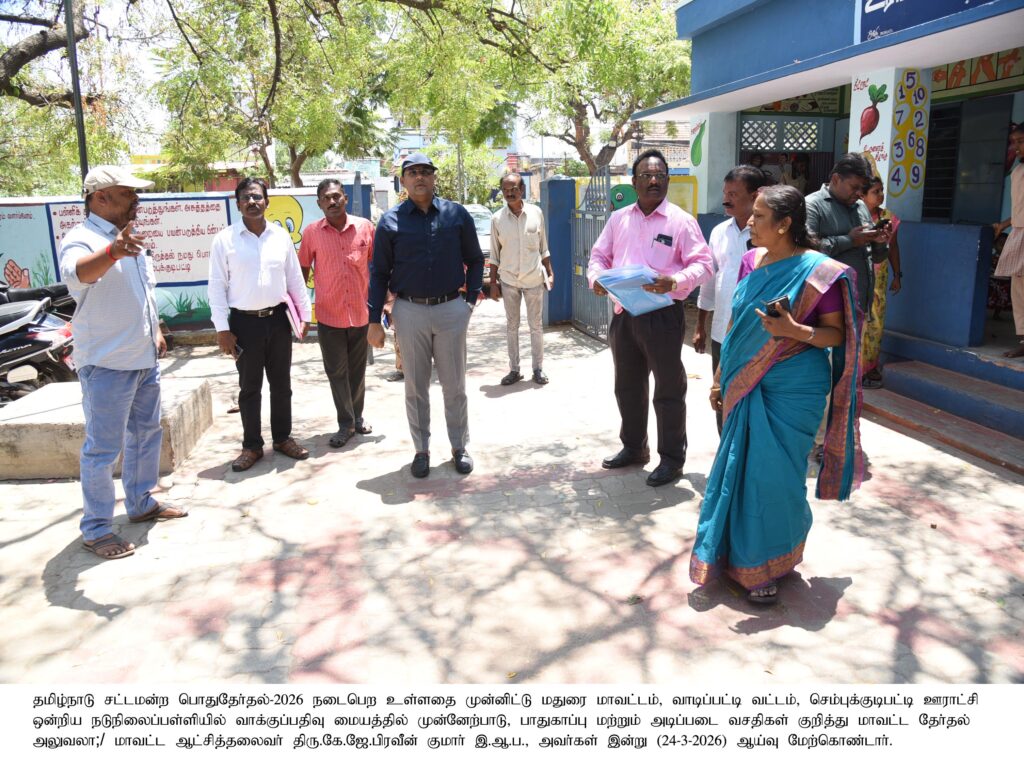 மாவட்டச்-செய்திகள் மாவட்ட தேர்தல் அலுவலர்/மாவட்ட ஆட்சியர் அவர்கள் சோழவந்தான் சட்டமன்ற தொகுதிக்குட்பட்ட பகுதிகளில் வாக்குச்சாவடி மையத்தில் அடிப்படை வசதிகள் குறித்து ஆய்வு மேற்கொண்ட புகைப்படம் Spread the love Post navigation Previous பழனியில் பங்குனி உத்திரம் திருவிழாNext மதுரை மாவட்ட தேர்தல் அலுவலர்/ மாவட்ட ஆட்சியர் அவர்கள் மின்னணு வாக்குப்பதிவு இயந்திரம் (EVM) மற்றும் வாக்களித்ததை உறுதி செய்யும் ஒப்புகைச் சீட்டுக் கருவி (VVPAT) ஆகியவற்றை சட்டமன்ற தொகுதி வாரியாக பிரித்து அனுப்பும் பணி புகைப்படம் More Stories மாவட்டச்-செய்திகள் 9 நாட்களில் ரூ.179 கோடி பணம், பொருட்கள் பறிமுதல்: தலைமை தேர்தல் அதிகாரி தகவல் மாவட்டச்-செய்திகள் வாக்காளர்களே அலர்ட்! வாக்காளர் பட்டியலில் பெயர் சேர்க்க நாளை கடைசி நாள்- தேர்தல் ஆணையம் அறிவிப்பு மாவட்டச்-செய்திகள் மாவட்ட தேர்தல் அலுவலர்/மாவட்ட ஆட்சியர் அவர்கள் வாடிப்பட்டியில் தேர்தல் அலுவலருக்கு பயிற்சி வகுப்பு நடைபெறும் மையத்தை பார்வையிட்டு ஆய்வு செய்த புகைப்படம்