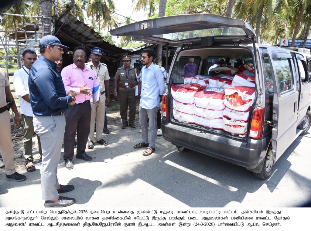 மாவட்டச்-செய்திகள் மாவட்ட தேர்தல் அலுவலர்/ மாவட்ட ஆட்சியர் அவர்கள் வாகன தணிக்கையில் ஈடுபட்டு இருந்த பறக்கும் படை அலுவலர்கள் பணியினை பார்வையிட்டு ஆய்வு செய்த புகைப்படம் Spread the love Post navigation Previous மதுரை மாவட்ட தேர்தல் அலுவலர்/ மாவட்ட ஆட்சியர் அவர்கள் மின்னணு வாக்குப்பதிவு இயந்திரம் (EVM) மற்றும் வாக்களித்ததை உறுதி செய்யும் ஒப்புகைச் சீட்டுக் கருவி (VVPAT) ஆகியவற்றை சட்டமன்ற தொகுதி வாரியாக பிரித்து அனுப்பும் பணி புகைப்படம்Next மாவட்ட தேர்தல் அலுவலர்/மாவட்ட ஆட்சியர் அவர்கள் சோழவந்தான் சட்டமன்ற தொகுதிக்குட்பட்ட பகுதியில் முதியோர்கள் மற்றும் மாற்றுத் திறனாளிகளுக்கு தபால் மூலம் வாக்களிப்பது குறித்து ஆய்வு மேற்கொண்ட புகைப்படம் More Stories மாவட்டச்-செய்திகள் 9 நாட்களில் ரூ.179 கோடி பணம், பொருட்கள் பறிமுதல்: தலைமை தேர்தல் அதிகாரி தகவல் மாவட்டச்-செய்திகள் வாக்காளர்களே அலர்ட்! வாக்காளர் பட்டியலில் பெயர் சேர்க்க நாளை கடைசி நாள்- தேர்தல் ஆணையம் அறிவிப்பு மாவட்டச்-செய்திகள் மாவட்ட தேர்தல் அலுவலர்/மாவட்ட ஆட்சியர் அவர்கள் வாடிப்பட்டியில் தேர்தல் அலுவலருக்கு பயிற்சி வகுப்பு நடைபெறும் மையத்தை பார்வையிட்டு ஆய்வு செய்த புகைப்படம்