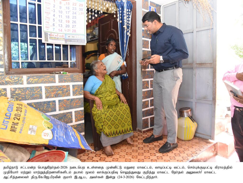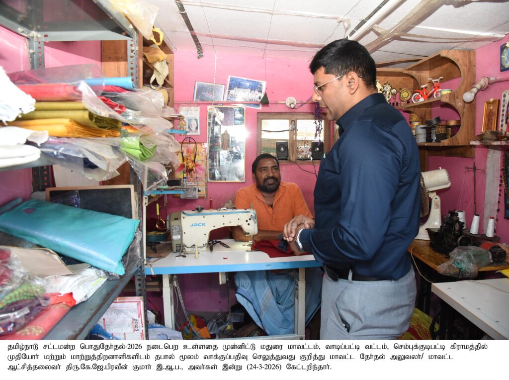 மாவட்டச்-செய்திகள் மாவட்ட தேர்தல் அலுவலர்/மாவட்ட ஆட்சியர் அவர்கள் சோழவந்தான் சட்டமன்ற தொகுதிக்குட்பட்ட பகுதியில் முதியோர்கள் மற்றும் மாற்றுத் திறனாளிகளுக்கு தபால் மூலம் வாக்களிப்பது குறித்து ஆய்வு மேற்கொண்ட புகைப்படம் Spread the love Post navigation Previous மாவட்ட தேர்தல் அலுவலர்/ மாவட்ட ஆட்சியர் அவர்கள் வாகன தணிக்கையில் ஈடுபட்டு இருந்த பறக்கும் படை அலுவலர்கள் பணியினை பார்வையிட்டு ஆய்வு செய்த புகைப்படம்Next மாவட்ட தேர்தல் அலுவலர்/மாவட்ட ஆட்சியர் அவர்கள் சோழவந்தான் சட்டமன்ற தொகுதி தேர்தல் நடத்தும் அலுவலரின் அலுவலகம் மற்றும் மின்னணு வாக்குப்பதிவு இயந்திரங்களை பாதுகாப்பு வைப்பதற்கான அமைக்கப்பட்ட காப்பறையை பார்வையிட்டு ஆய்வு செய்த புகைப்படம் More Stories மாவட்டச்-செய்திகள் 9 நாட்களில் ரூ.179 கோடி பணம், பொருட்கள் பறிமுதல்: தலைமை தேர்தல் அதிகாரி தகவல் மாவட்டச்-செய்திகள் வாக்காளர்களே அலர்ட்! வாக்காளர் பட்டியலில் பெயர் சேர்க்க நாளை கடைசி நாள்- தேர்தல் ஆணையம் அறிவிப்பு மாவட்டச்-செய்திகள் மாவட்ட தேர்தல் அலுவலர்/மாவட்ட ஆட்சியர் அவர்கள் வாடிப்பட்டியில் தேர்தல் அலுவலருக்கு பயிற்சி வகுப்பு நடைபெறும் மையத்தை பார்வையிட்டு ஆய்வு செய்த புகைப்படம்