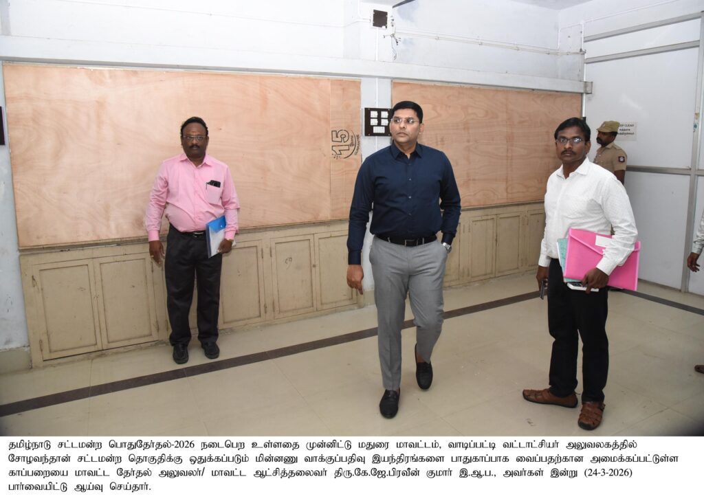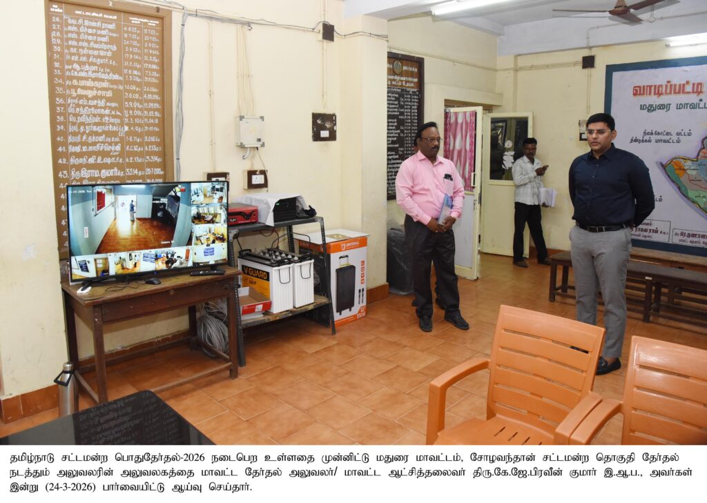 மாவட்ட தேர்தல் அலுவலர்/மாவட்ட ஆட்சியர் அவர்கள் வாடிப்பட்டியில் தேர்தல் அலுவலருக்கு பயிற்சி வகுப்பு நடைபெறும் மையத்தை பார்வையிட்டு ஆய்வு செய்த புகைப்படம்