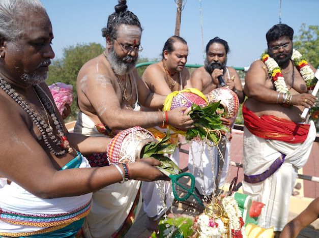 9 மணிக்கு மகாபூர்ணாகதி, 9.15 கலசங்களுடன் புறப்பாடு நடந்தது. .9.45 மணிக்கு காசி இராமேஸ்வரம் அழகர் கோயில் பாபநாசம் உள்ளிட்ட பல்வேறு புண்ணிய ஸ்தலங்களில் இருந்து எடுத்து வரப்பட்ட புனிதநீர் ஊற்றி