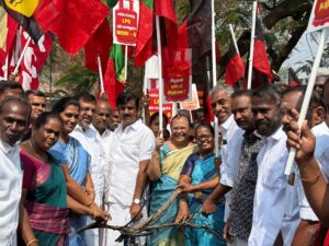 பழனியில் திமுக கூட்டணி கட்சியினர் சச்சிதானந்தம் எம்பி தலைமையில் ஆர்ப்பாட்டம் செய்தனர்